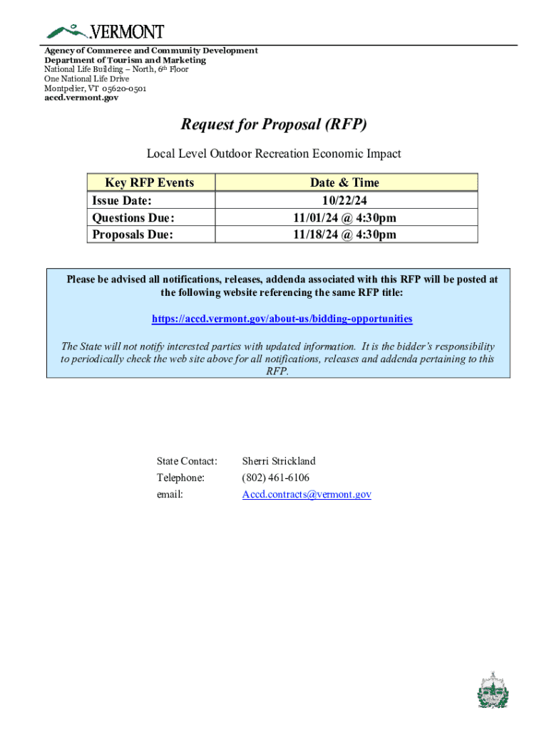 Agency of Commerce and Community Development Department of Tourism and Marketing National Life Building North, 6th Floor One National Life Drive Montpelier, VT 056200501 accd.vermont.govRequest for