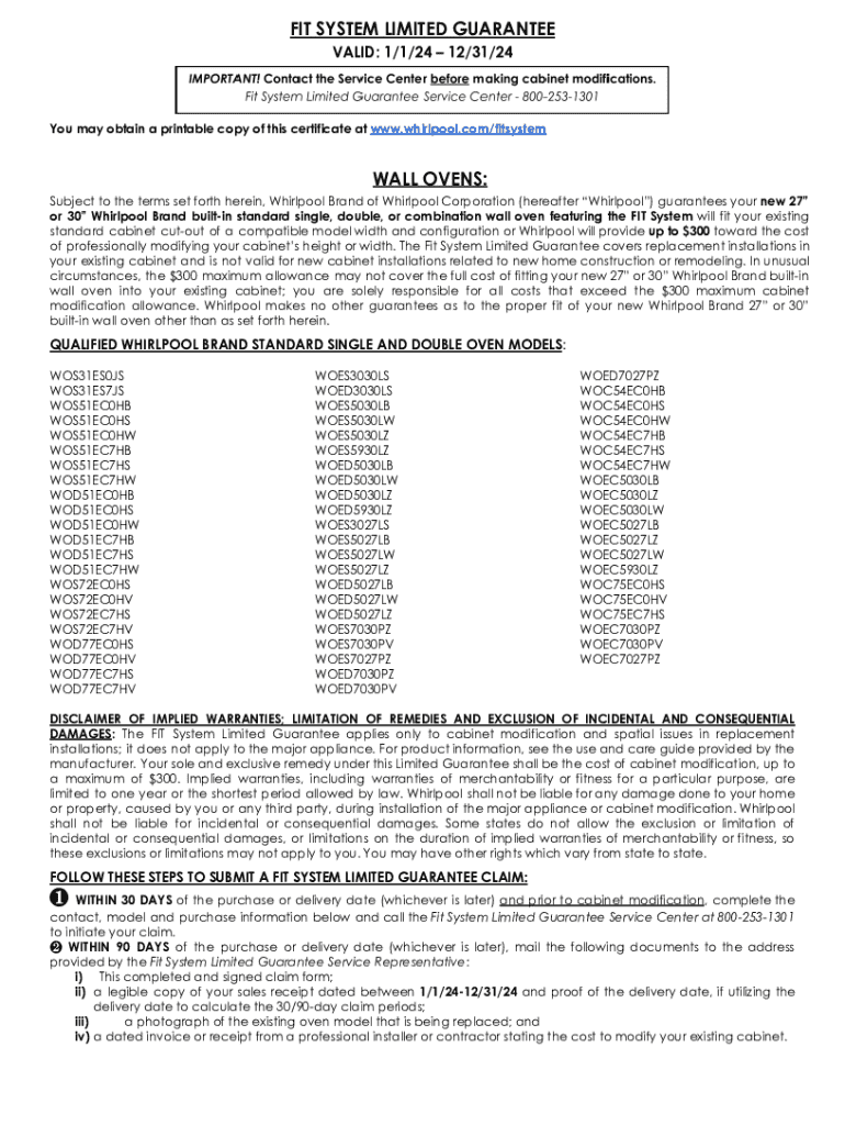 FIT SYSTEM LIMITED GUARANTEE VALID: 1/1/24 12/31/24You may obtain a printable copy of this certificate at www.whirlpool.com/fitsystemWALL OVENS: Subject to the terms set forth herein, Whirlpool Brand