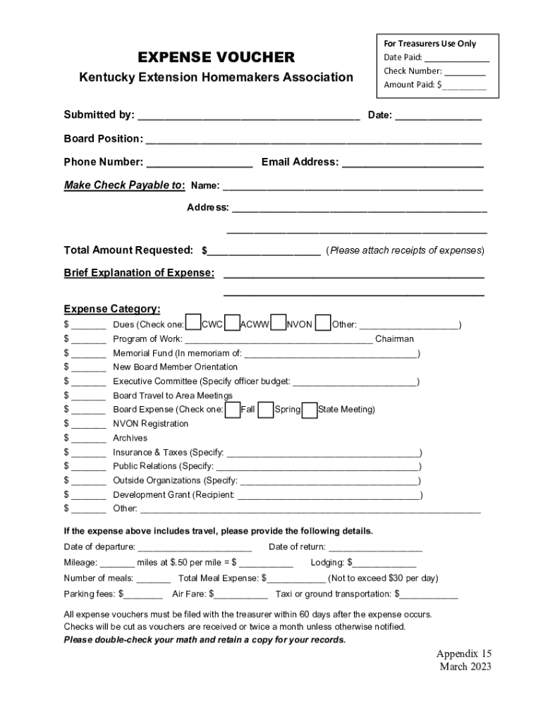 EXPENSE VOUCHER Kentucky Extension Homemakers AssociationFor Treasurers Use Only Date Paid: ___ Check Number: ___ Amount Paid: $___Submitted by: ___ Date: ___ Board Position: ___ Phone Number: ___