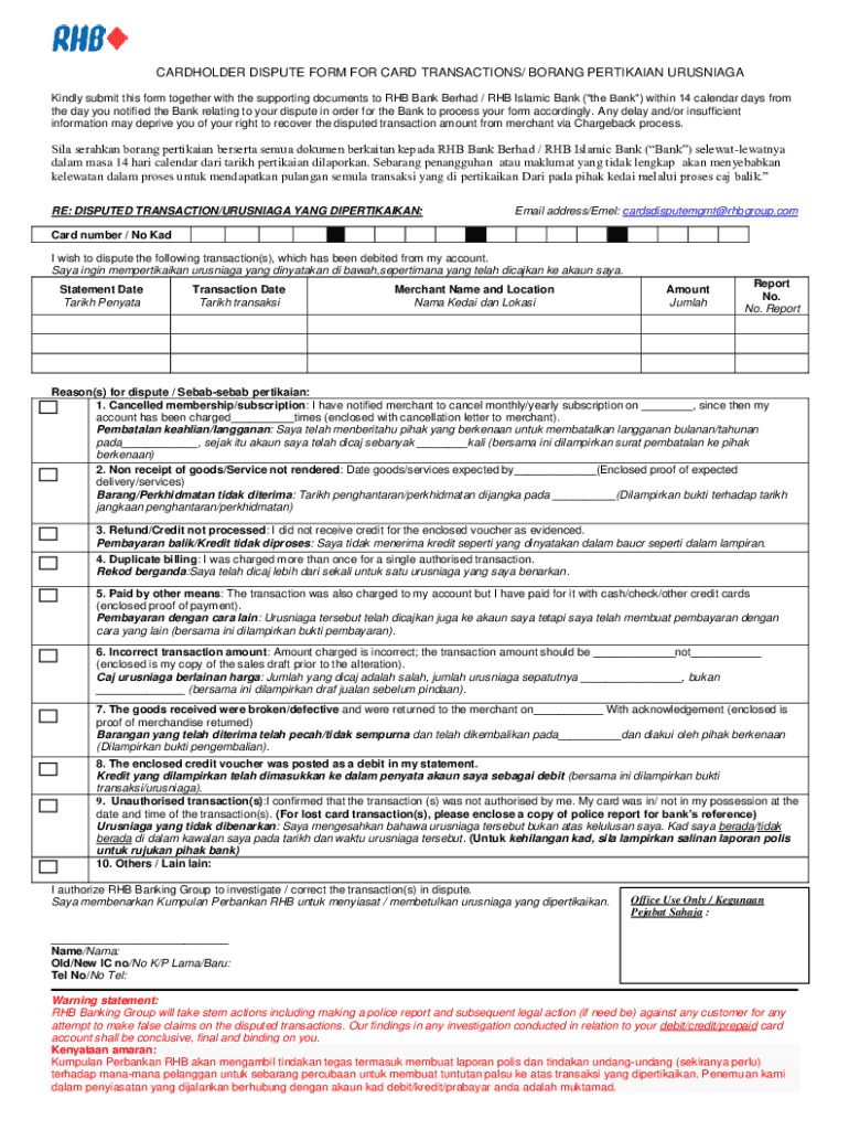 CARDHOLDER DISPUTE FORM FOR CARD TRANSACTIONS/ BORANG PERTIKAIAN URUSNIAGA Kindly submit this form together with the supporting documents to RHB Bank Berhad / RHB Islamic Bank (the Bank) within 14