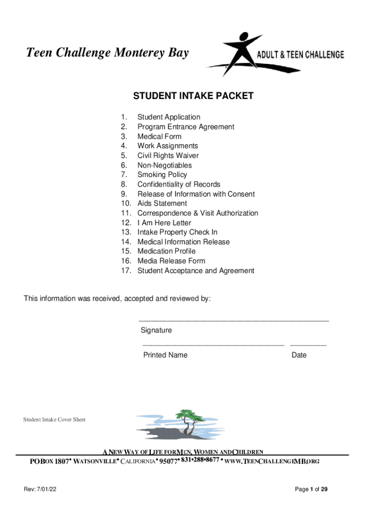 This document serves as a comprehensive intake packet for students entering the Teen Challenge Monterey Bay program, including various forms, agreements, and policies essential for enrollment. It covers topics such as student applications, medical forms, work assignments, policies on smoking and confidentiality, as well as a detailed outline of the program\'s expectations and responsibilities.