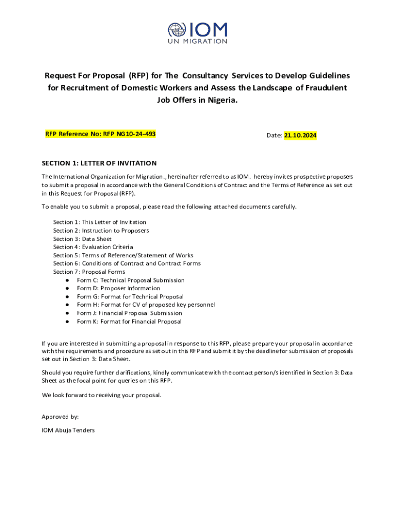 Request For Proposal (RFP) for The Consultancy Services to Develop Guidelines for Recruitment of Domestic Workers and Assess the Landscape of Fraudulent Job Offers in Nigeria.RFP Reference No: RFP