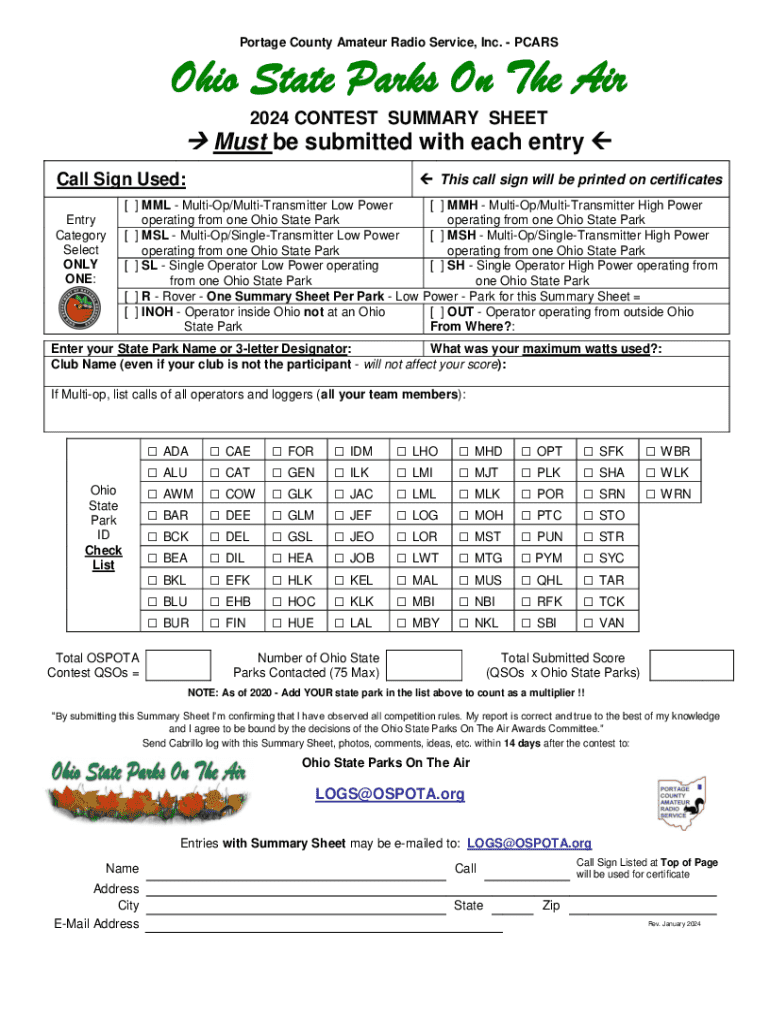 Portage County Amateur Radio Service, Inc. PCARSOhio State Parks On The Air 2024 CONTEST SUMMARY SHEET Must be submitted with each entry This call sign will be printed on certificatesCall Sign Used: