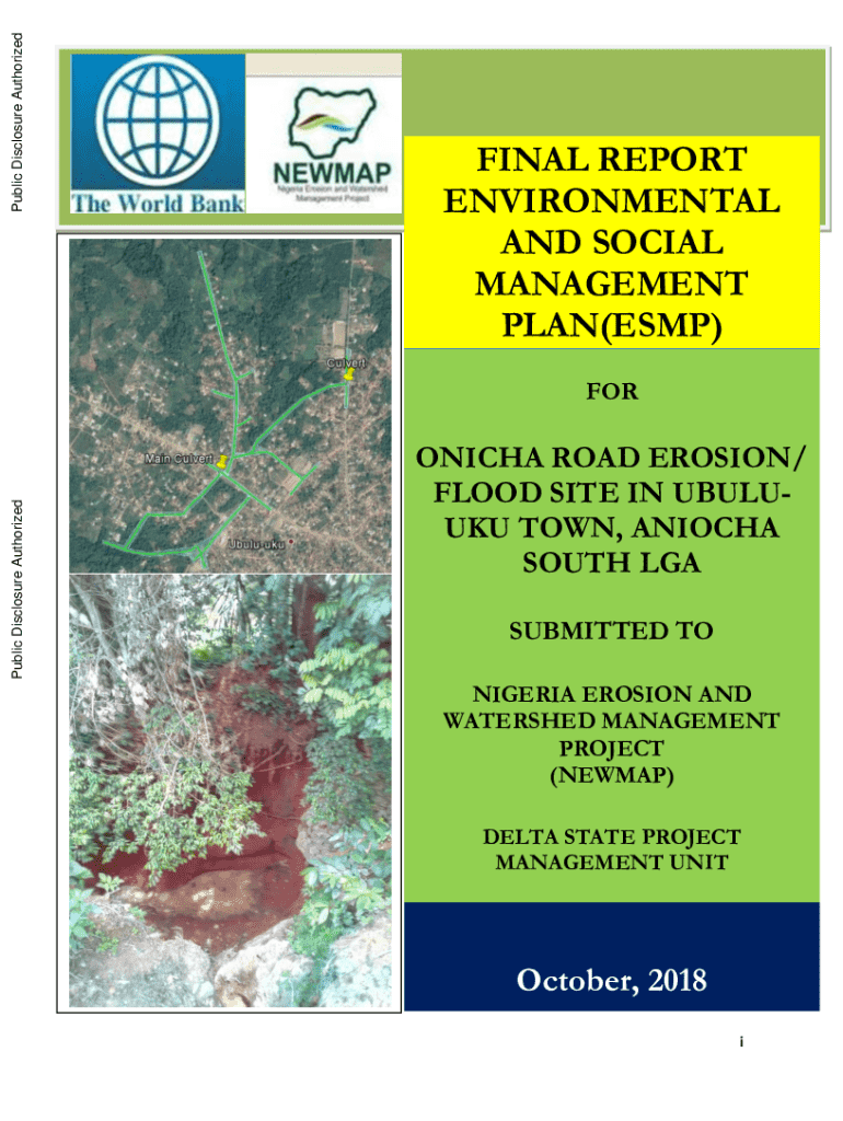This document details the Environmental and Social Management Plan (ESMP) for the Onicha Road Erosion/Flood site in Ubulu-Uku, Delta State, as part of the Nigeria Erosion and Watershed Management Project (NEWMAP). It outlines the objectives, proposed interventions, potential impacts, mitigation measures, and institutional frameworks necessary to manage environmental and social issues tied to the project.
