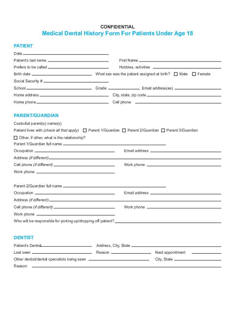 CONFIDENTIALMedical Dental History Form For Patients Under Age 18 PATIENT Date Patients last nameFirst NamePrefers to be calledHobbies, activitiesBirth dateWhat sex was the patient assigned at birth?MaleFemaleSocial