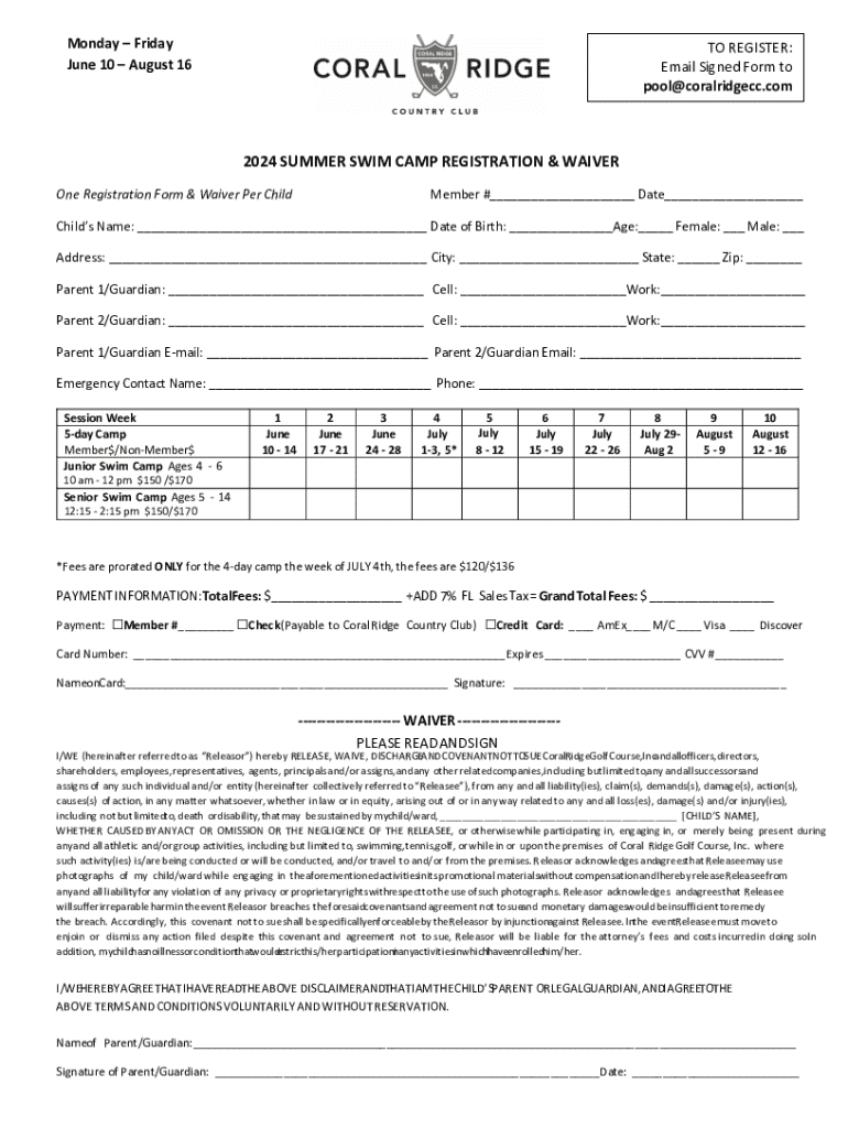 Monday Friday June 10 August 16TO REGISTER: Email Signed Form to pool@coralridgecc.com2024 SUMMER SWIM CAMP REGISTRATION & WAIVER One Registration Form & Waiver Per ChildMember #___ Date___Childs
