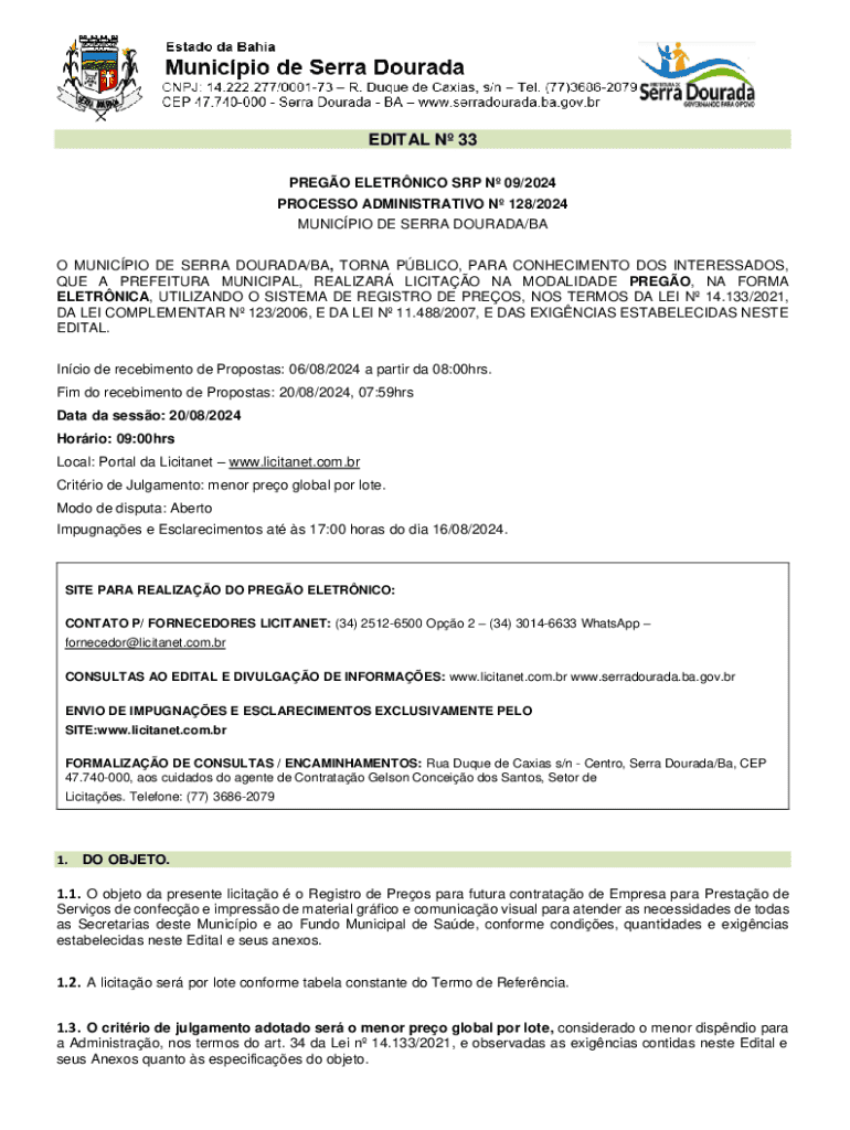 EDITAL N 33 PREGO ELETRNICO SRP N 09/2024 PROCESSO ADMINISTRATIVO N 128/2024 MUNICPIO DE SERRA DOURADA/BA O MUNICPIO DE SERRA DOURADA/BA, TORNA PBLICO, PARA CONHECIMENTO DOS INTERESSADOS, QUE A PREFEITURA