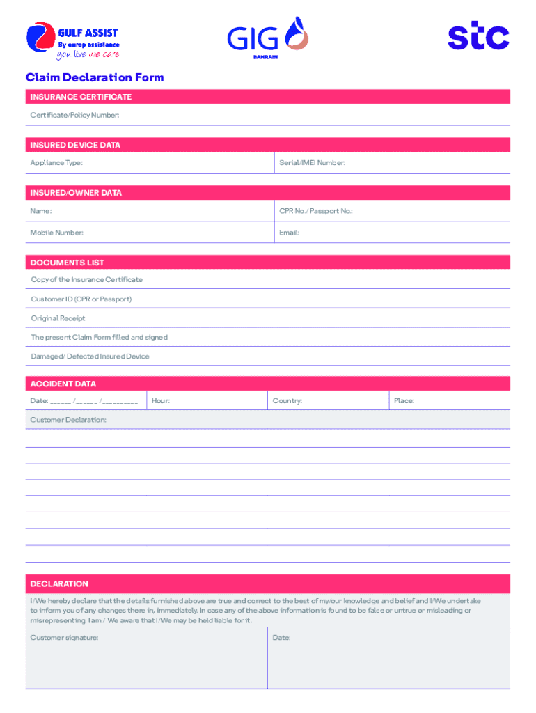 Claim Declaration Form INSURANCE CERTIFICATE Certificate/Policy Number:INSURED DEVICE DATA Appliance Type:Serial/IMEI Number:INSURED/OWNER DATA Name:CPR No./ Passport No.:Mobile Number:Email:DOCUMENTS