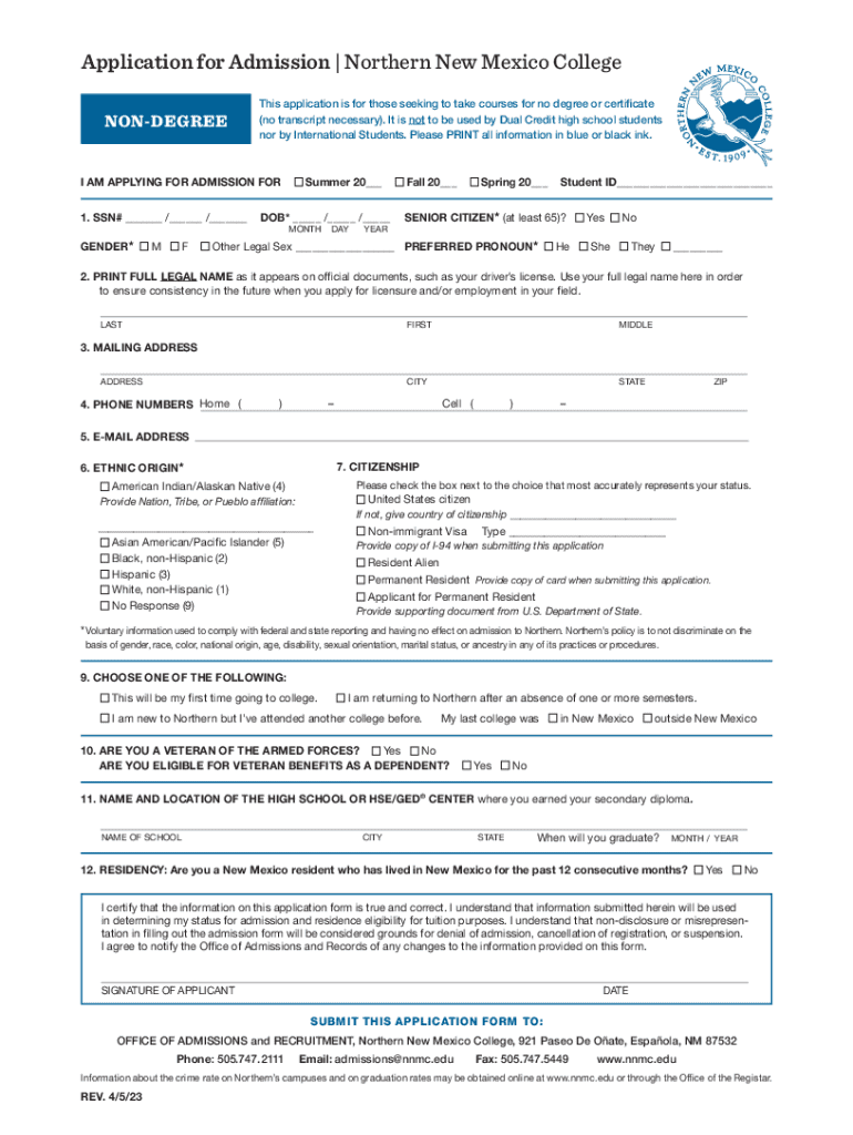 Application for Admission | Northern New Mexico College NONDEGREEThis application is for those seeking to take courses for no degree or certificate (no transcript necessary). It is not to be used