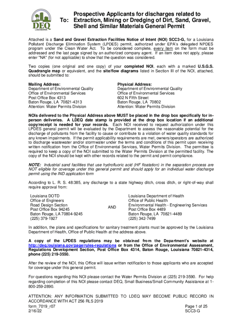 This document serves as a Notice of Intent (NOI) for prospective applicants seeking authorization to discharge wastewater and stormwater in Louisiana related to extraction, mining, or dredging of dirt, sand, gravel, shell, and similar materials. It outlines the application process, requirements for submission, and contact information for relevant departments. The NOI must be submitted to the Louisiana Department of Environmental Quality, along with necessary maps and diagrams. The document...