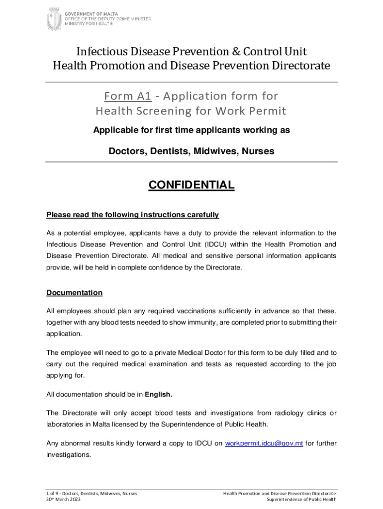 This document provides an application form for health screening required for work permit applicants in healthcare professions such as doctors, dentists, midwives, and nurses. It outlines necessary medical examinations, vaccinations, and personal information requirements to ensure compliance with health regulations.