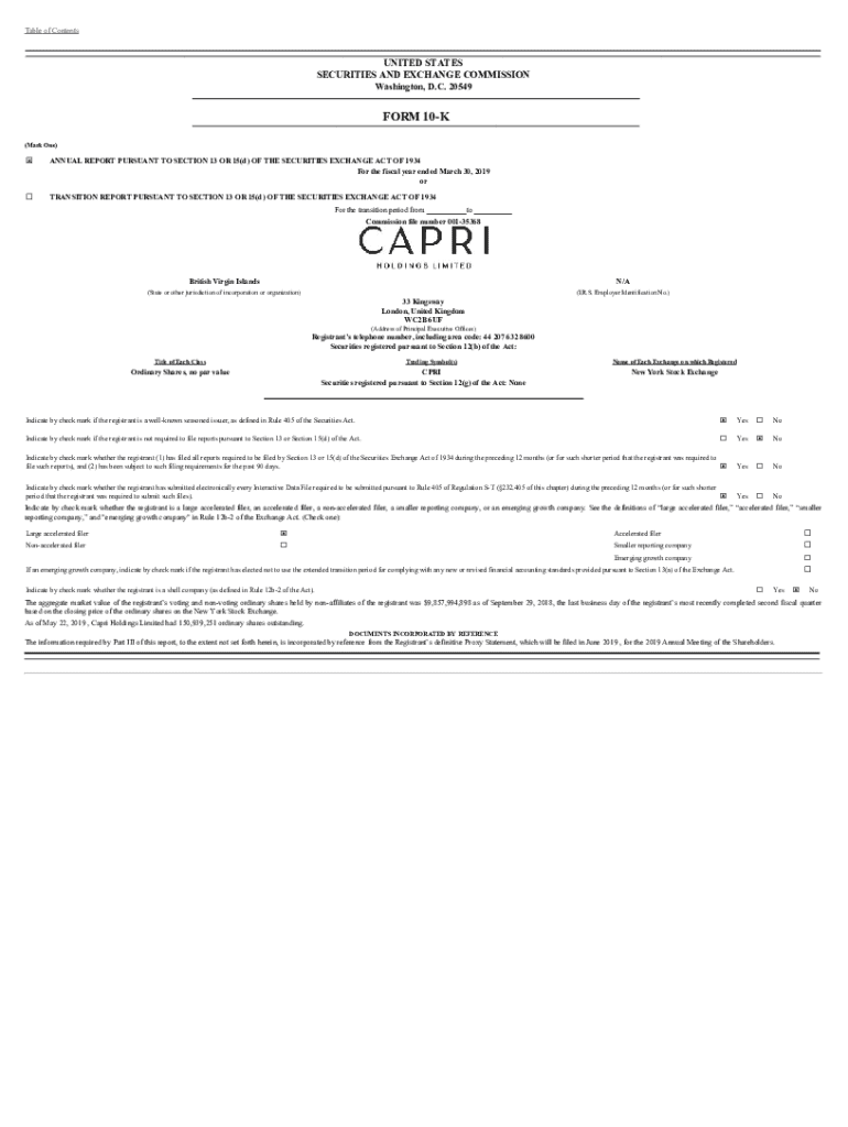 This document is the annual report for Capri Holdings Limited and includes detailed financial performance, business strategies, governance, and risk factors faced by the company. It covers the fiscal year ended March 30, 2019, and reports on operations for its luxury brands: Versace, Jimmy Choo, and Michael Kors.
