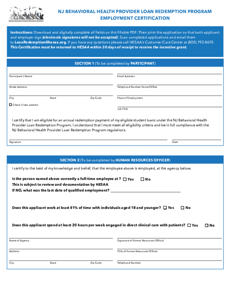 NJ BEHAVIORAL HEALTH PROVIDER LOAN REDEMPTION PROGRAM EMPLOYMENT CERTIFICATION Instructions: Download and digitally complete all fields on this fillable PDF. Then print the application so that both
