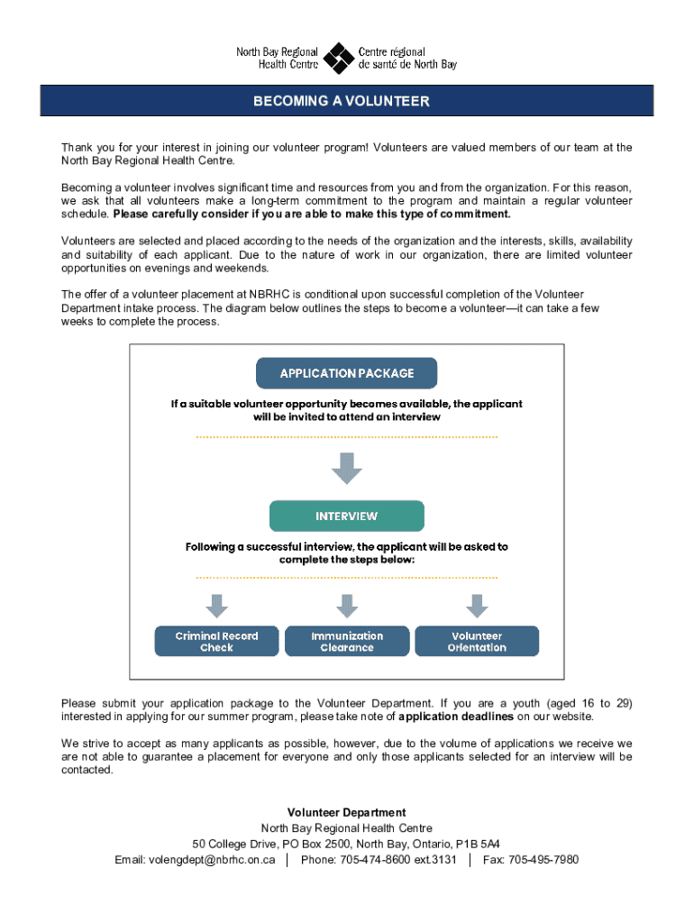 This document provides detailed information on how to apply for a volunteer position at the North Bay Regional Health Centre (NBRHC). It outlines the commitment required from volunteers, the intake process, and the necessary application materials. It also specifies age requirements, volunteer opportunities, and the importance of maintaining confidentiality within the organization.