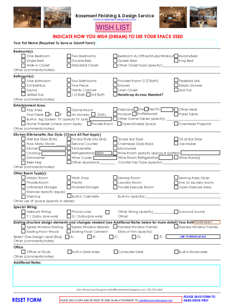 Basement Finishing & Design Service www.basementdesigner.comWISH LIST INDICATE HOW YOU WISH (DREAM) TO SEE YOUR SPACE USED Your Full Name (Required To Save or Submit Form): Bedroom(s): One Bedroom