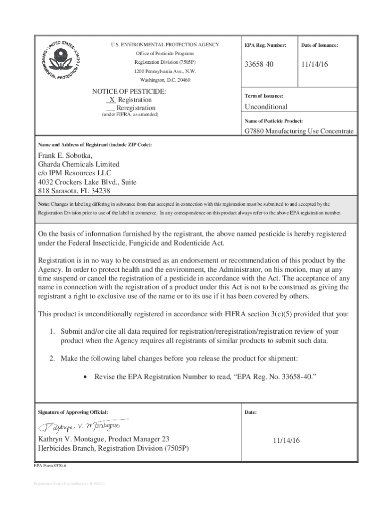 U.S. ENVIRONMENTAL PROTECTION AGENCYEPA Reg. Number:Date of Issuance:336584011/14/16Office of Pesticide Programs Registration Division (7505P) 1200 Pennsylvania Ave., N.W. Washington, D.C. 20460NOTICE