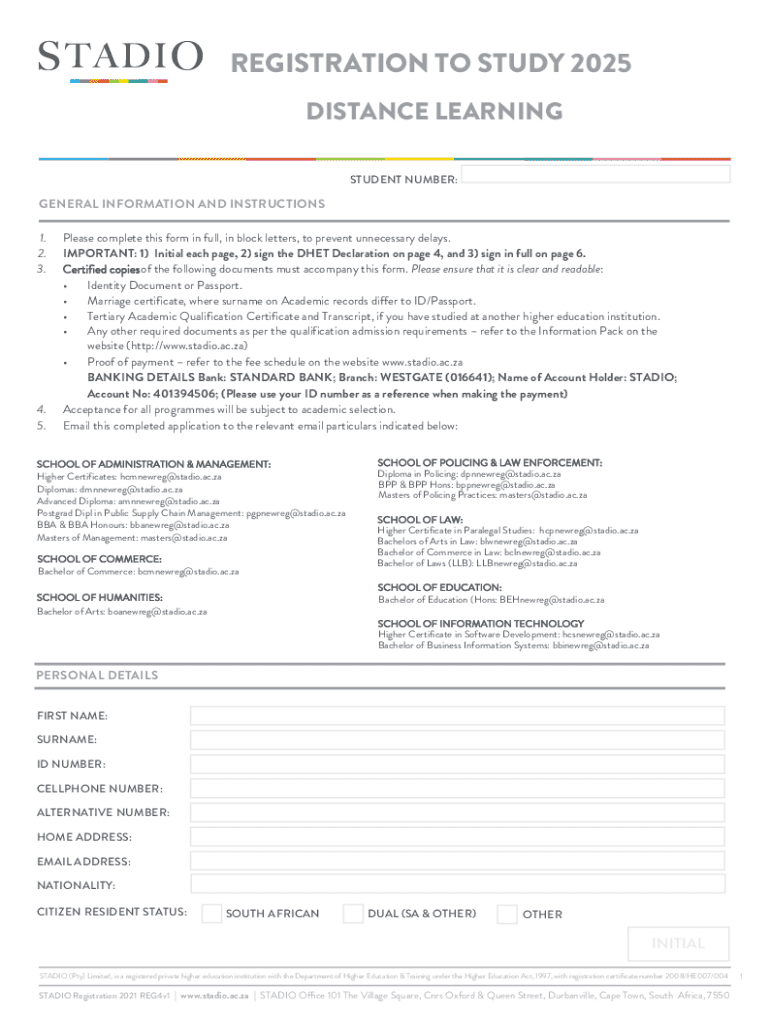 REGISTRATION TO STUDY 2025 DISTANCE LEARNING STUDENT NUMBER:GENERAL INFORMATION AND INSTRUCTIONS 1. 2. 3.4. 5.Please complete this form in full, in block letters, to prevent unnecessary delays. IMPORTANT:
