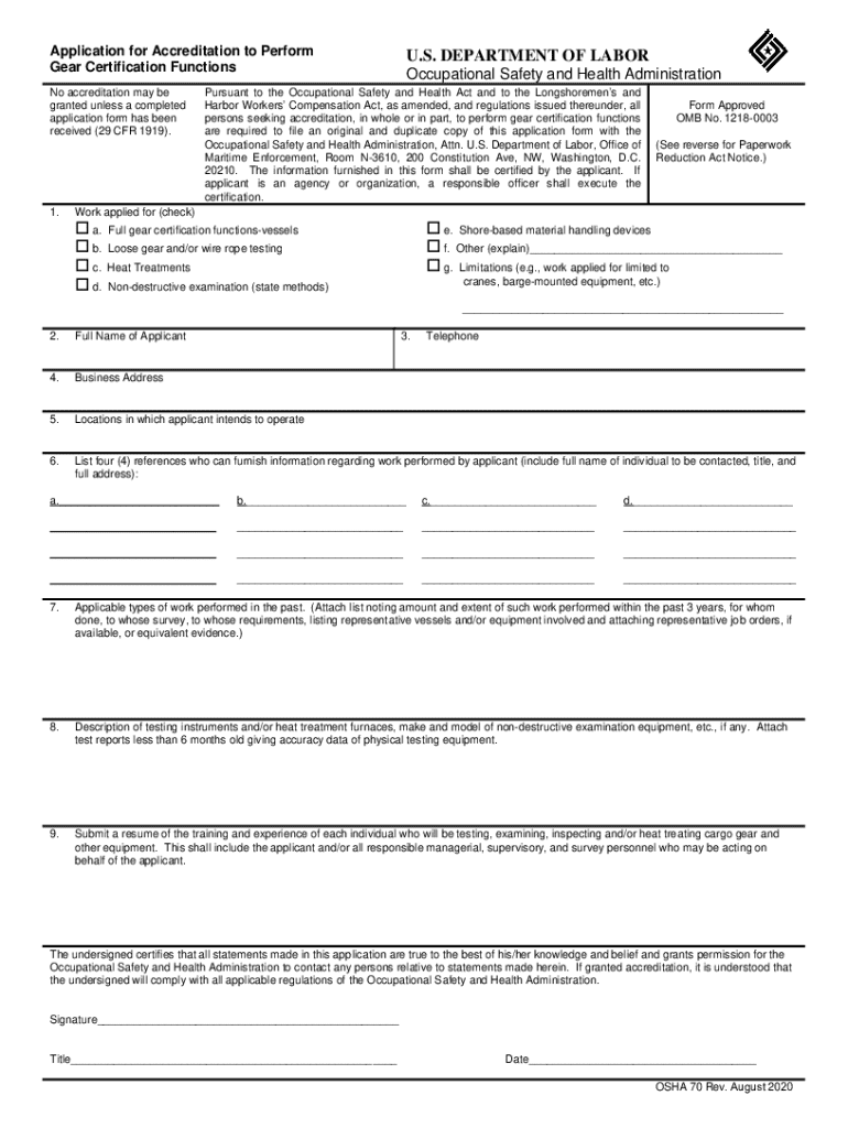 Application for Accreditation to Perform Gear Certification Functions No accreditation may be granted unless a completed application form has been received (29 CFR 1919).1.U.S. DEPARTMENT OF LABOR