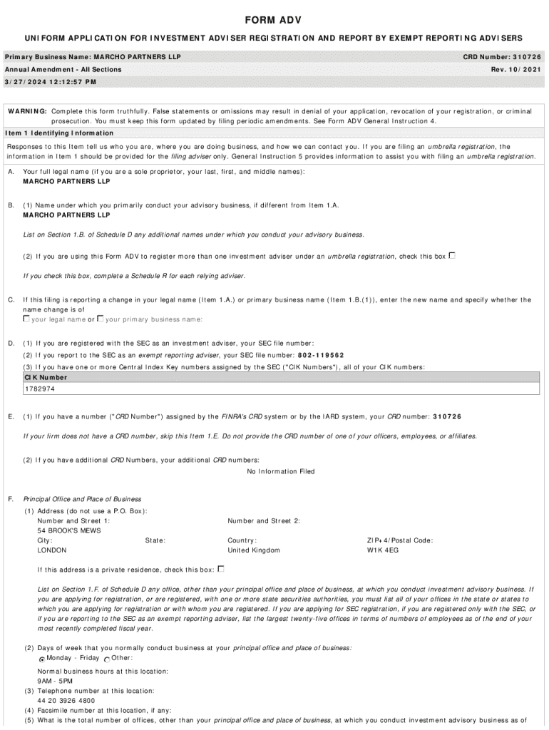 FORM ADV UNIFORM APPLICATION FOR INVESTMENT ADVISER REGISTRATION AND REPORT BY EXEMPT REPORTING ADVISERS Primary Business Name: MARCHO PARTNERS LLPCRD Number: 310726Annual Amendment All SectionsRev.