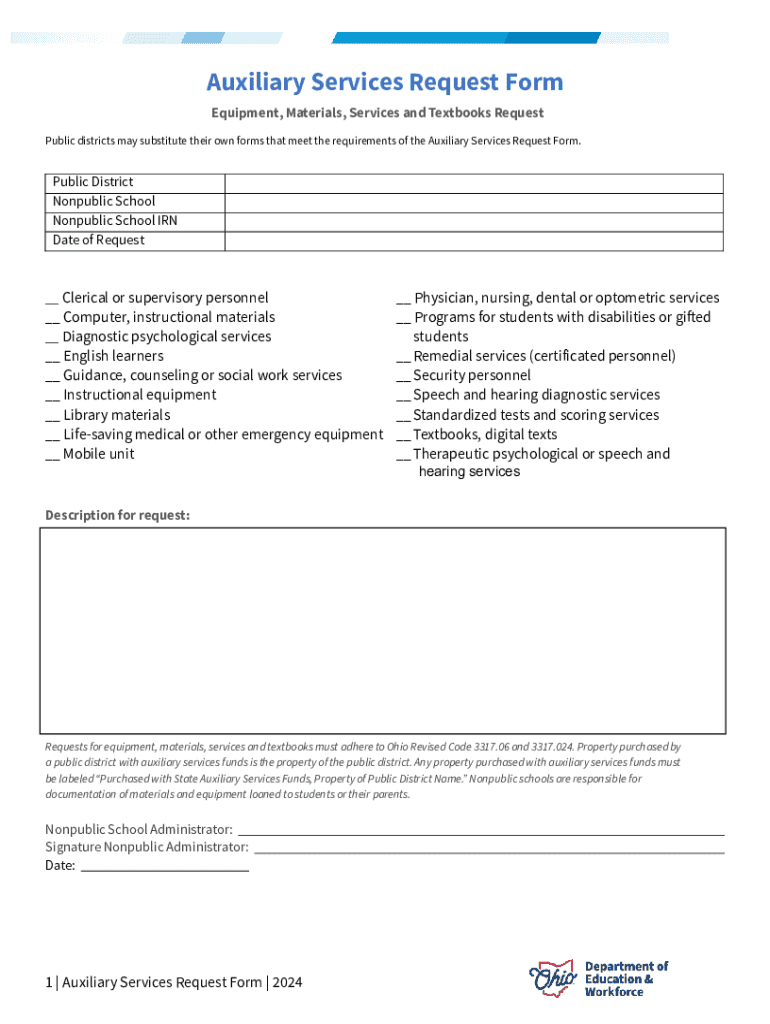 Auxiliary Services Request Form Equipment, Materials, Services and Textbooks Request Public districts may substitute their own forms that meet the requirements of the Auxiliary Services Request Form.Public