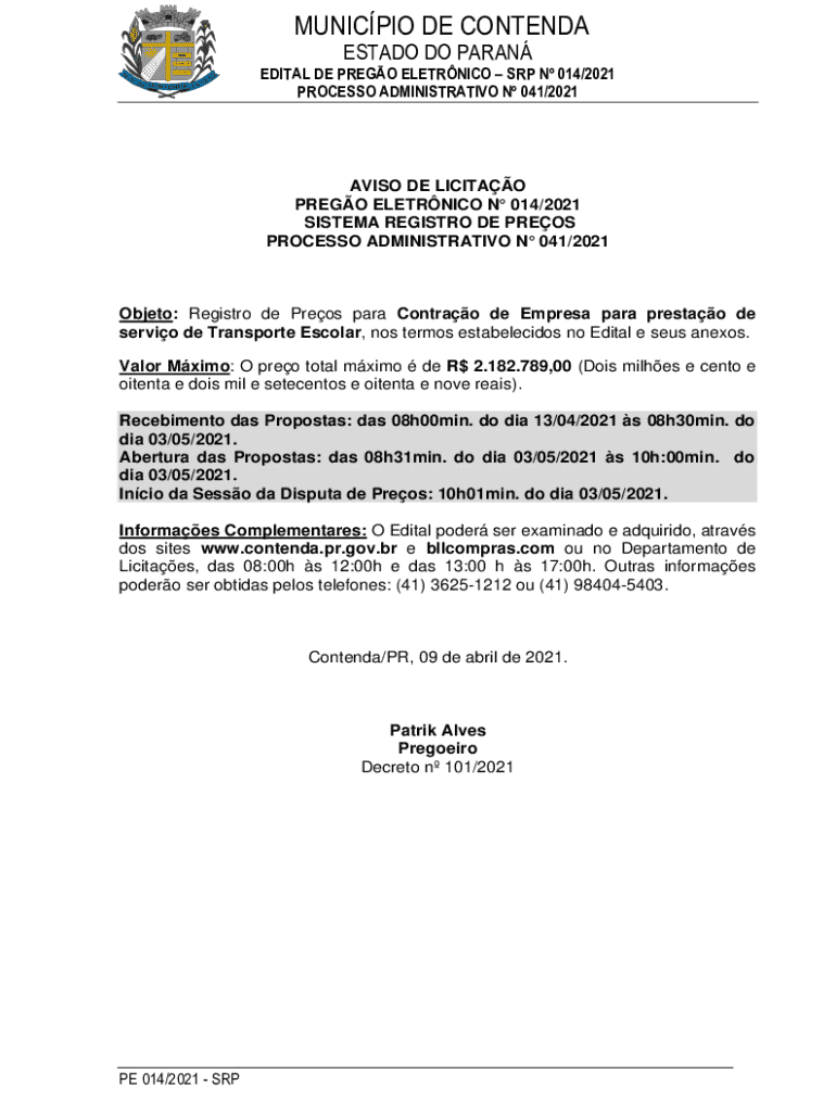 MUNICPIO DE CONTENDA TRABALHOPROGRESSO141 52 15 21 C O N T E N D A 141ESTADO DO PARAN EDITAL DE PREGO ELETRNICO SRP N 014/2021 PROCESSO ADMINISTRATIVO N 041/2021AVISO DE LICITAO PREGO ELETRNICO N