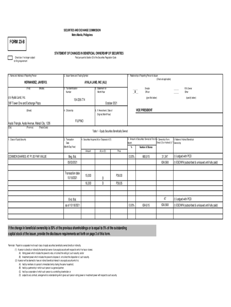 This document is a filing made by a reporting person regarding changes in beneficial ownership of securities as required by the Securities Regulation Code. It includes information about the reporting person\'s name, address, relationship to the issuer, citizenship, tax identification number, and details about equity securities owned, including transactions and ownership changes.