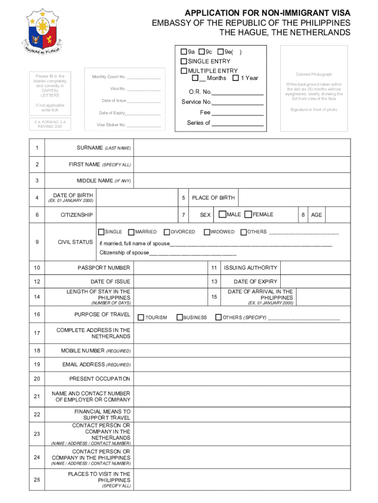 This document is an application form for obtaining a non-immigrant visa to the Philippines from the Embassy of the Republic of the Philippines in The Hague, The Netherlands. It includes various personal details and travel information that must be filled out by the applicant.