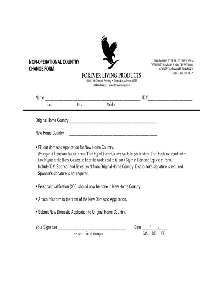 This form is intended for distributors of Forever Living Products who reside in a non-operational country and wish to change their home country. It outlines the necessary steps and requirements to complete the change, including the need to fill out a new domestic application form for the desired home country.