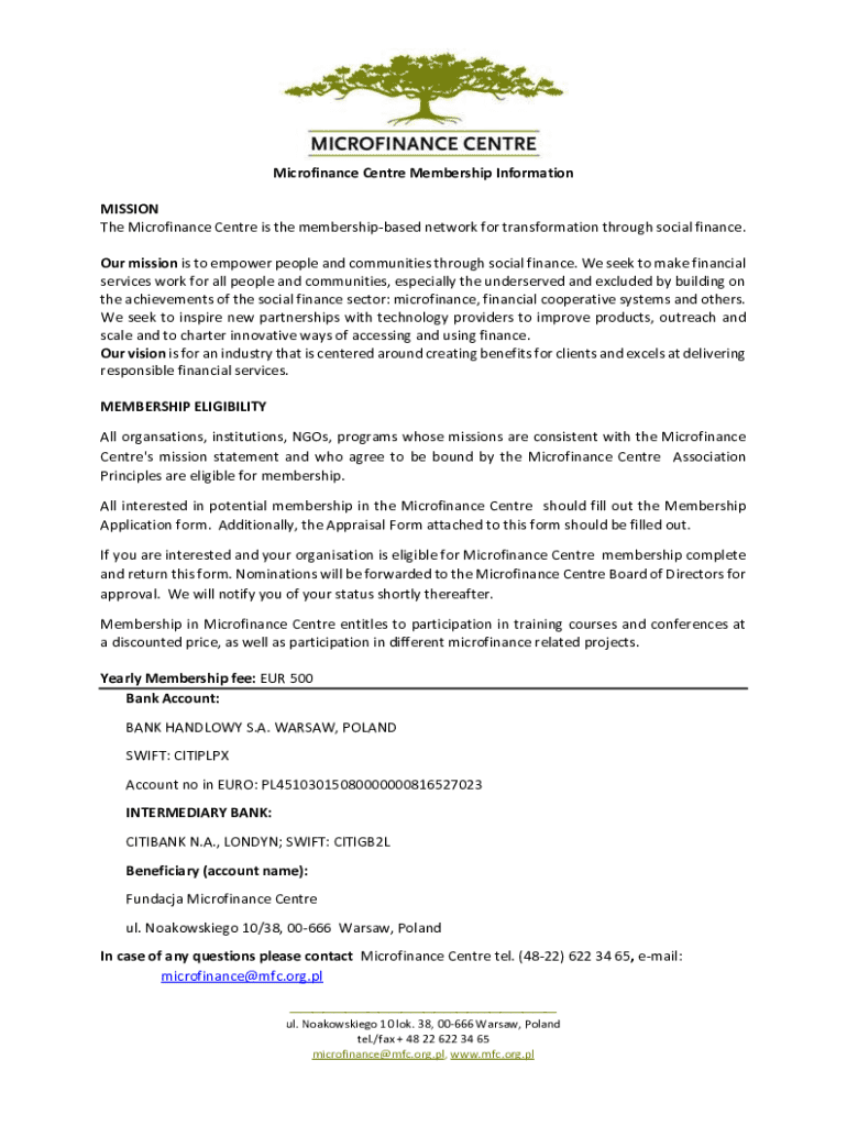 Microfinance Centre Membership Information MISSION The Microfinance Centre is the membershipbased network for transformation through social finance. Our mission is to empower people and communities