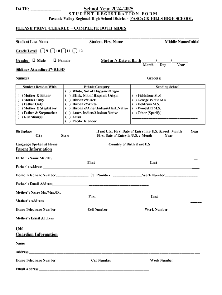 School Year 20242025DATE: ___STUDENT REGISTRATION FORM Pascack Valley Regional High School District PASCACK HILLS HIGH SCHOOLPLEASE PRINT CLEARLY COMPLETE BOTH SIDES ___Student Last Name Grade Level