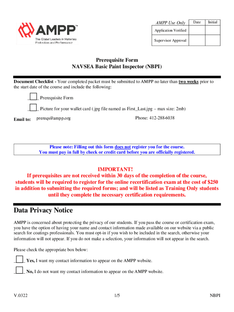 This document serves as an application form for individuals seeking to enroll in the NAVSEA Basic Paint Inspector (NBPI) Program. It outlines the prerequisites, required documentation, and various sections to capture applicant information, work experience, and attestations related to ethical standards and professional conduct. Additionally, it emphasizes the importance of timely submission of materials to avoid penalties.