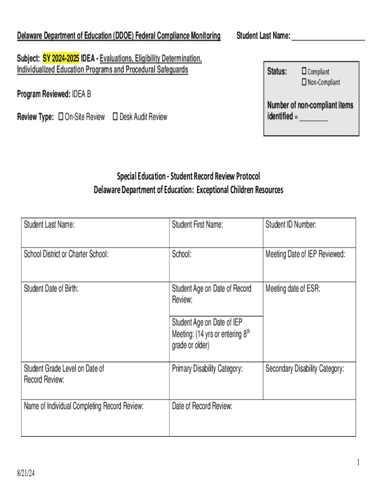 Delaware Department of Education (DDOE) Federal Compliance MonitoringStudent Last Name: ___Subject: SY 20242025 IDEA Evaluations, Eligibility Determination, Individualized Education Programs and Procedural