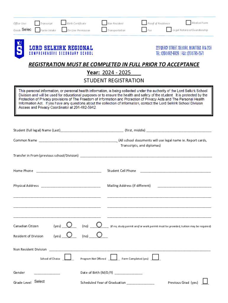 This document outlines the requirements and procedures for registering a new student at Lord Selkirk Regional Comprehensive Secondary School (LSRCSS), including necessary documents for proof of age, residency, and guardianship, as well as specific forms for School of Choice and Program Not Offered. It details the enrollment criteria, including residency, citizenship, and specific forms necessary for students in care. Additionally, it contains sections for medical information, technology use...