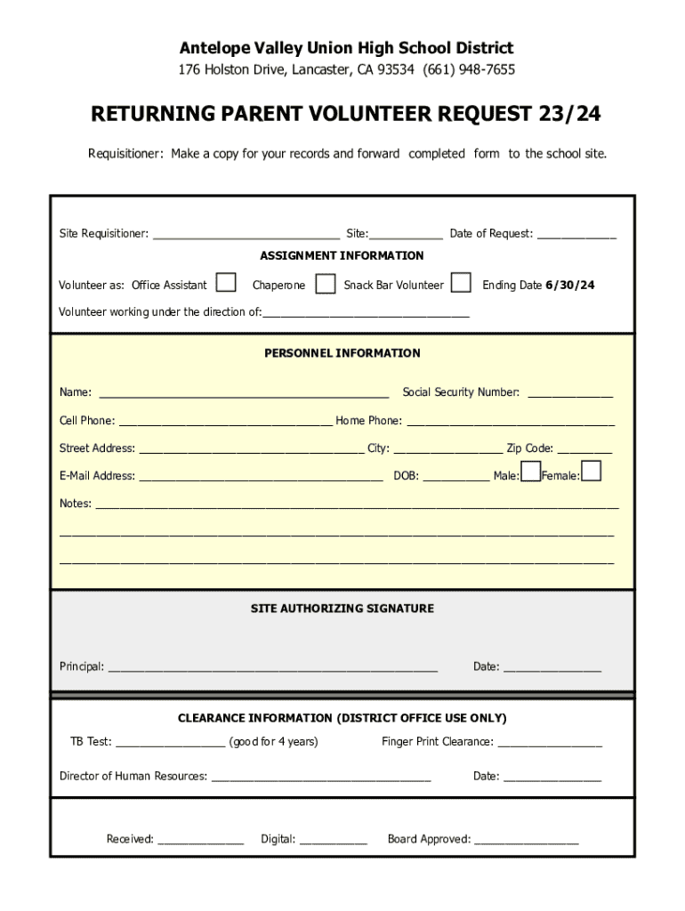 A form for parents to register as volunteers for various roles within the Antelope Valley Union High School District, including office assistant, chaperone, and snack bar volunteer, for the 2023/2024 school year.
