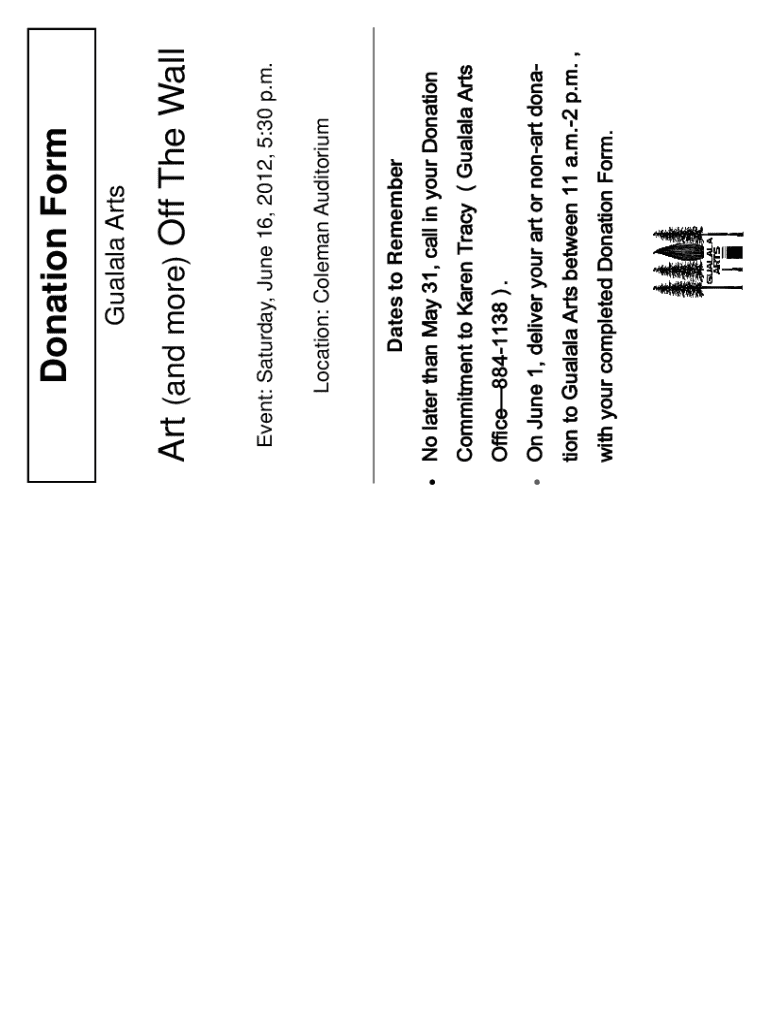 This document serves as a donation form for the Gualala Arts event, \'Art (and more) Off The Wall—2012\'. It outlines the process for donating art or non-art items to support Gualala Arts, including important dates, types of acceptable donations, and the commitment and delivery process. The event aims to raise funds for the Arts Center and offers donors an opportunity to support the arts community.