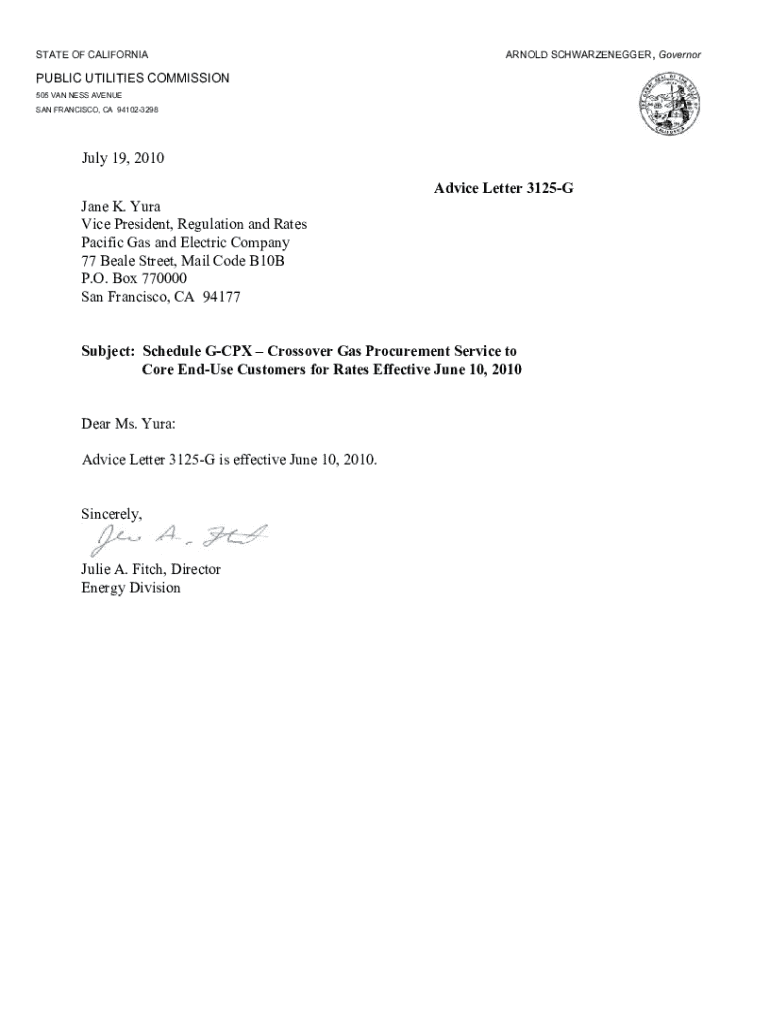 This Advice Letter filed by Pacific Gas and Electric Company outlines updates to the Crossover Gas Procurement Service rates effective June 10, 2010, in compliance with California Public Utilities Commission decisions. The letter details the applicable rates for different classes of customers and includes provisions for protests and confidentiality.