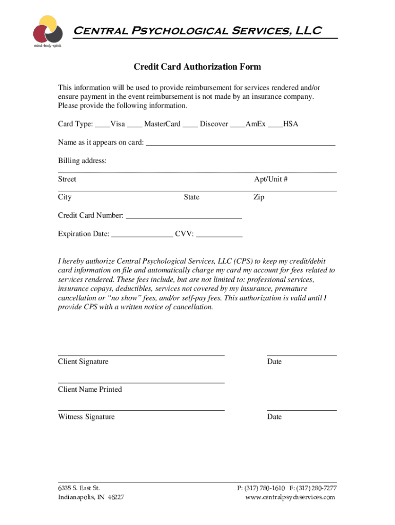 Central Psychological Services, LLC Credit Card Authorization Form This information will be used to provide reimbursement for services rendered and/or ensure payment in the event reimbursement is