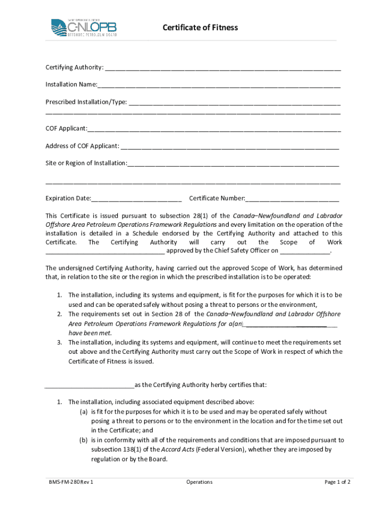 Certificate of FitnessCertifying Authority: ___ Installation Name:___ Prescribed Installation/Type: ___ ___ COF Applicant:___ Address of COF Applicant: ___ Site or Region of Installation:___ ___ Expiration