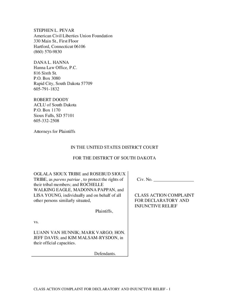 This document is a class action complaint filed in the United States District Court for the District of South Dakota by the Oglala Sioux Tribe and the Rosebud Sioux Tribe, along with individual plaintiffs, against various state officials. The complaint alleges violations of the Due Process Clause of the Fourteenth Amendment and the Indian Child Welfare Act (ICWA) related to the wrongful removal of Indian children from their homes without proper legal hearings and safeguards. The plaintiffs...