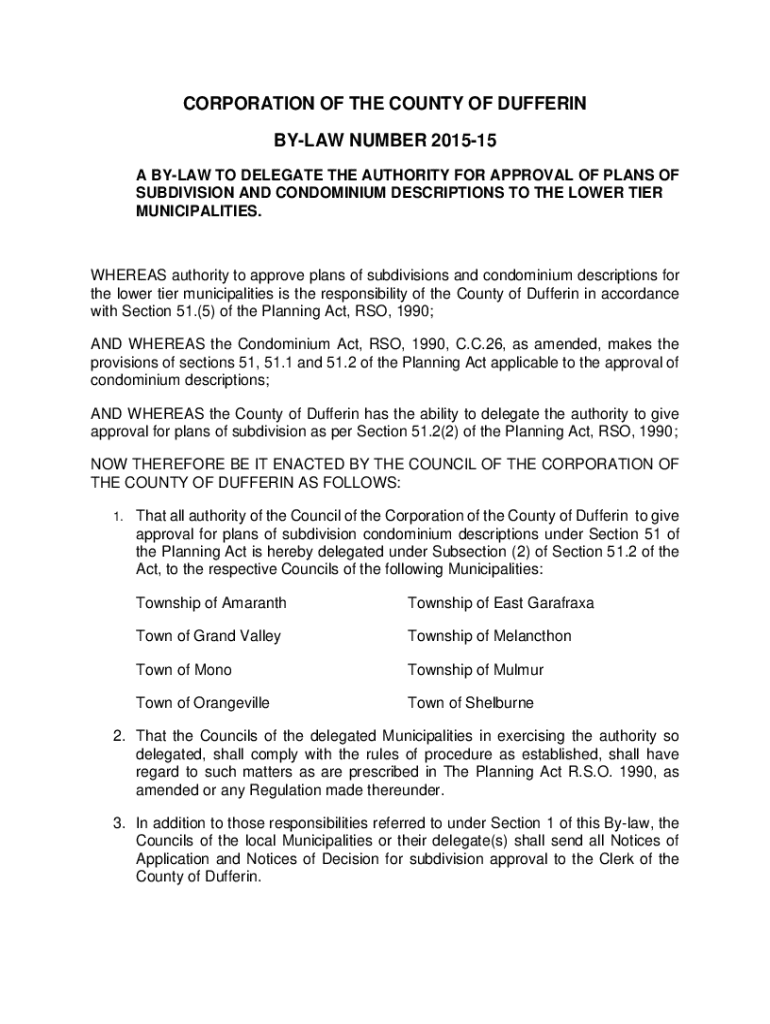 This by-law delegations the authority from the County of Dufferin to the lower tier municipalities for the approval of plans of subdivision and condominium descriptions, in compliance with the Planning Act and Condominium Act of Ontario.