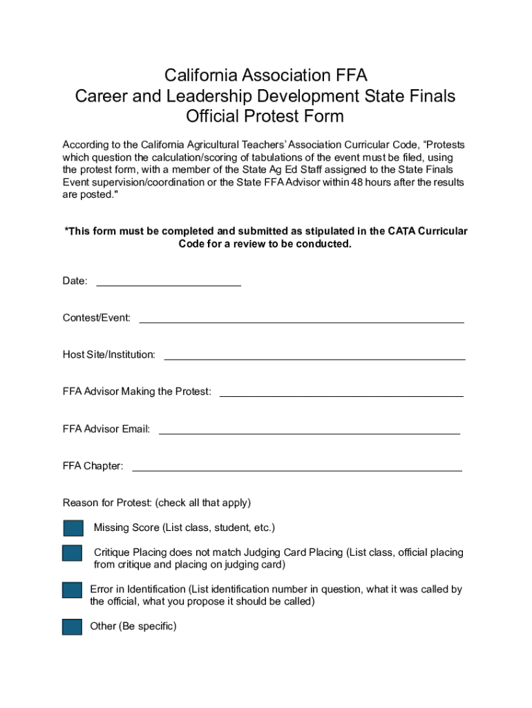 California Association FFA Career and Leadership Development State Finals Official Protest Form According to the California Agricultural Teachers Association Curricular Code, Protests which question