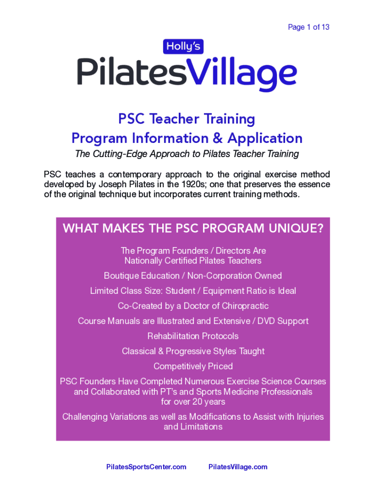 The PSC Teacher Training Program offers a comprehensive Pilates education that combines classical and progressive styles. This program, led by certified Pilates instructors, includes extensive classroom instruction and hands-on teaching experience. Participants will gain knowledge in anatomy, client assessment, program design, and professional skills necessary to succeed in Pilates instruction.