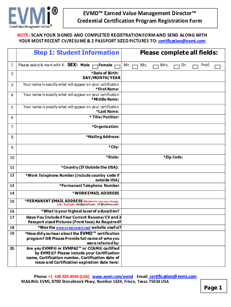 EVMD Earned Value Management Director Credential Certification Program Registration Form NOTE: SCAN YOUR SIGNED AND COMPLETED REGISTRATION FORM AND SEND ALONG WITH YOUR MOST RECENT CV/RESUME & 2 PASSPORT
