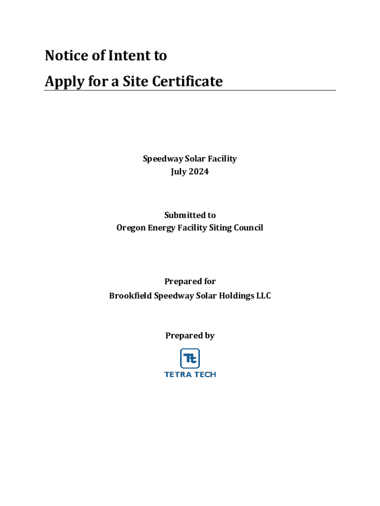 This document outlines the Notice of Intent to apply for a site certificate for the Speedway Solar Facility, detailing the energy generation capacity, facility description, environmental impacts, permits needed, and community service impacts associated with the proposed solar project in Sherman County, Oregon.