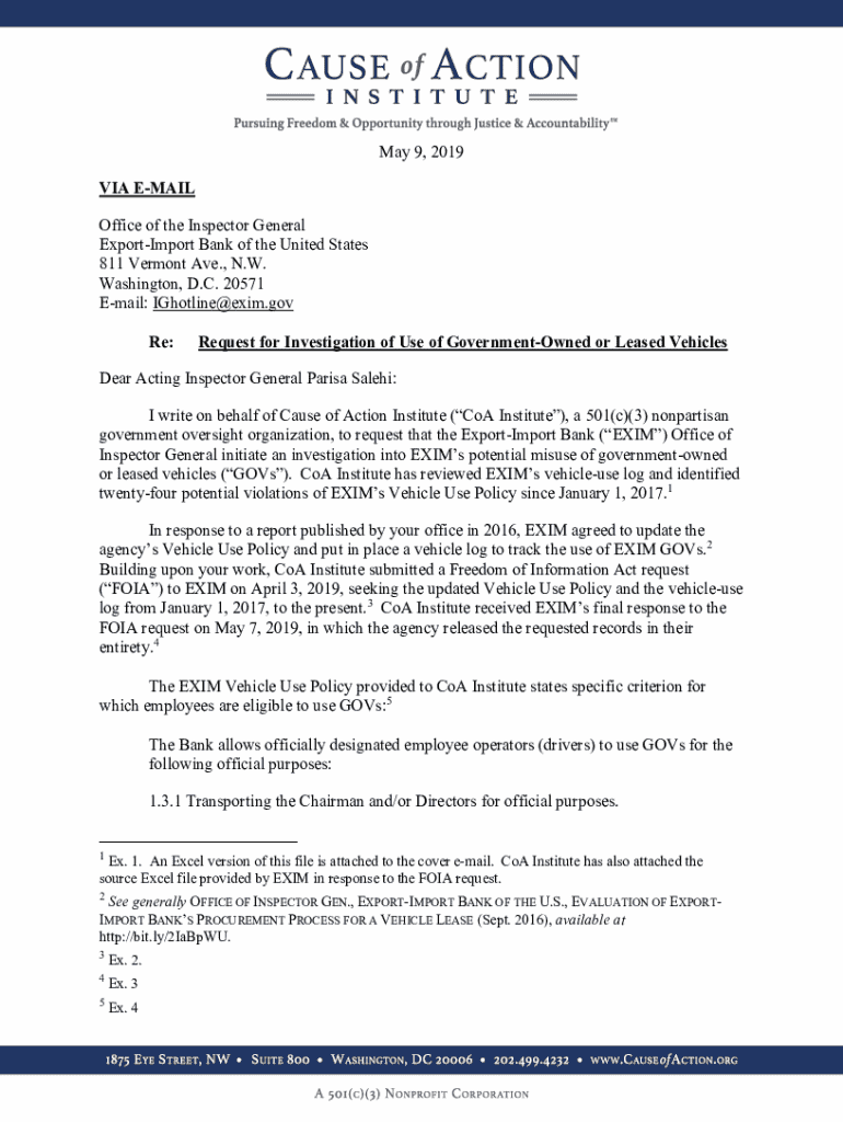 May 9, 2019 VIA EMAIL Office of the Inspector General ExportImport Bank of the United States 811 Vermont Ave., N.W. Washington, D.C. 20571 Email: IGhotline@exim.gov Re:Request for Investigation of