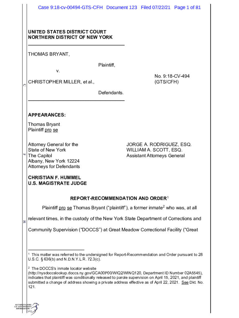 Case 9:18cv00494GTSCFH Document 123 Filed 07/22/21 Page 1 of 81UNITED STATES DISTRICT COURT NORTHERN DISTRICT OF NEW YORK ___ THOMAS BRYANT, Plaintiff,v. CHRISTOPHER MILLER, et al.,No. 9:18CV494 (GTS/CFH)Defendants.