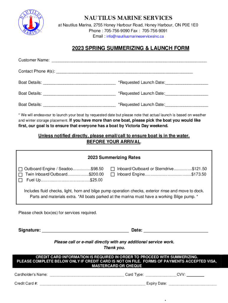 NAUTILUS MARINE SERVICES at Nautilus Marina, 2755 Honey Harbour Road, Honey Harbour, ON P0E 1E0 Phone : 7057569090 Fax : 7057569091 Email : info@nautilusmarineservicesinc.ca2023 SPRING SUMMERIZING
