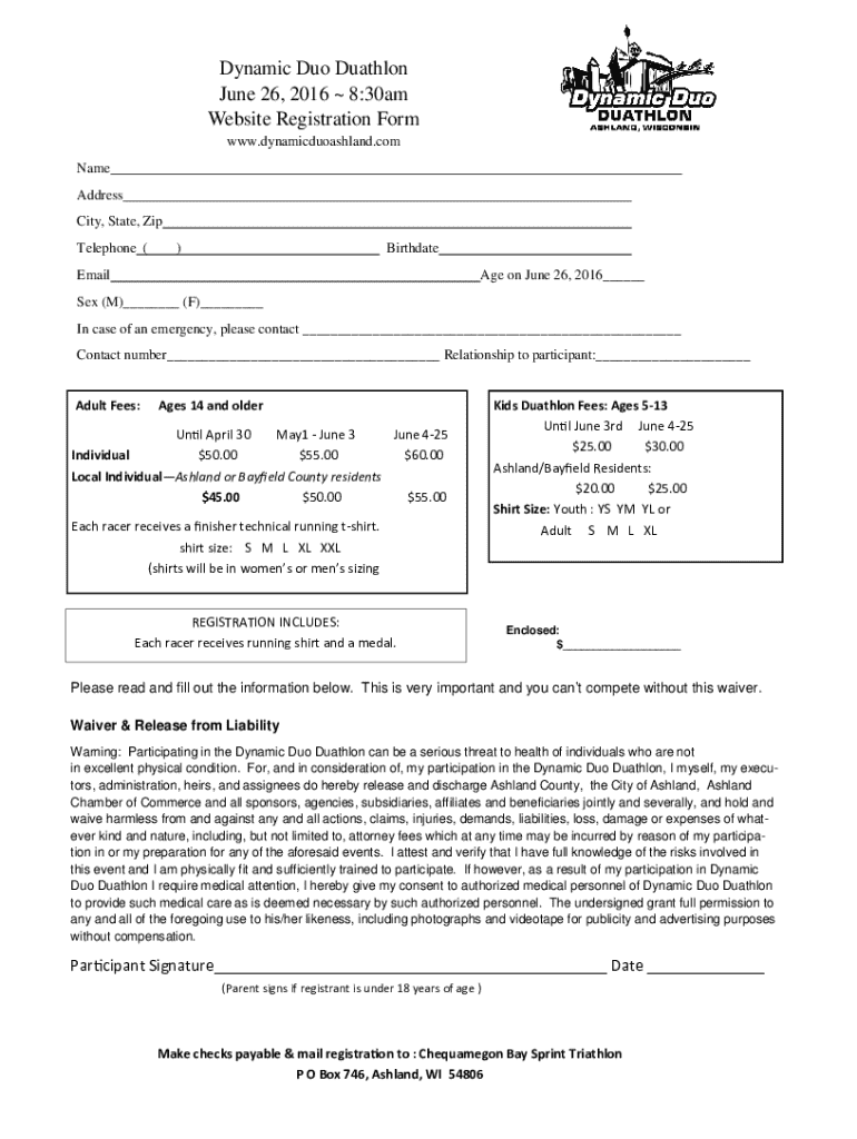 This form is for registering participants for the Dynamic Duo Duathlon event taking place on June 26, 2016. It collects personal information, emergency contact details, and includes a waiver and release from liability for participants. The form outlines registration fees for adults and kids, along with details about included items such as shirts and medals.