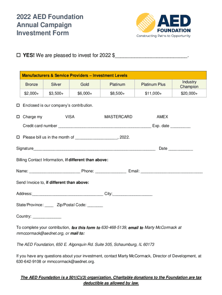 This form is used by companies and individuals to make monetary contributions to the AED Foundation for the 2022 annual campaign. It outlines different investment levels and provides options for payment methods while ensuring donation details are recorded.
