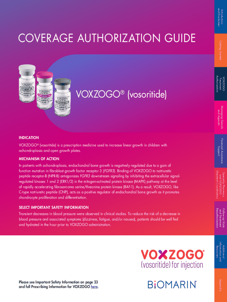 This guide provides comprehensive information on obtaining treatment authorization for VOXZOGO, a medication designed to enhance linear growth in children with achondroplasia and open growth plates. It covers various topics such as prior authorization, managing denials and appeals, financial assistance support, and coordination with specialty pharmacies.
